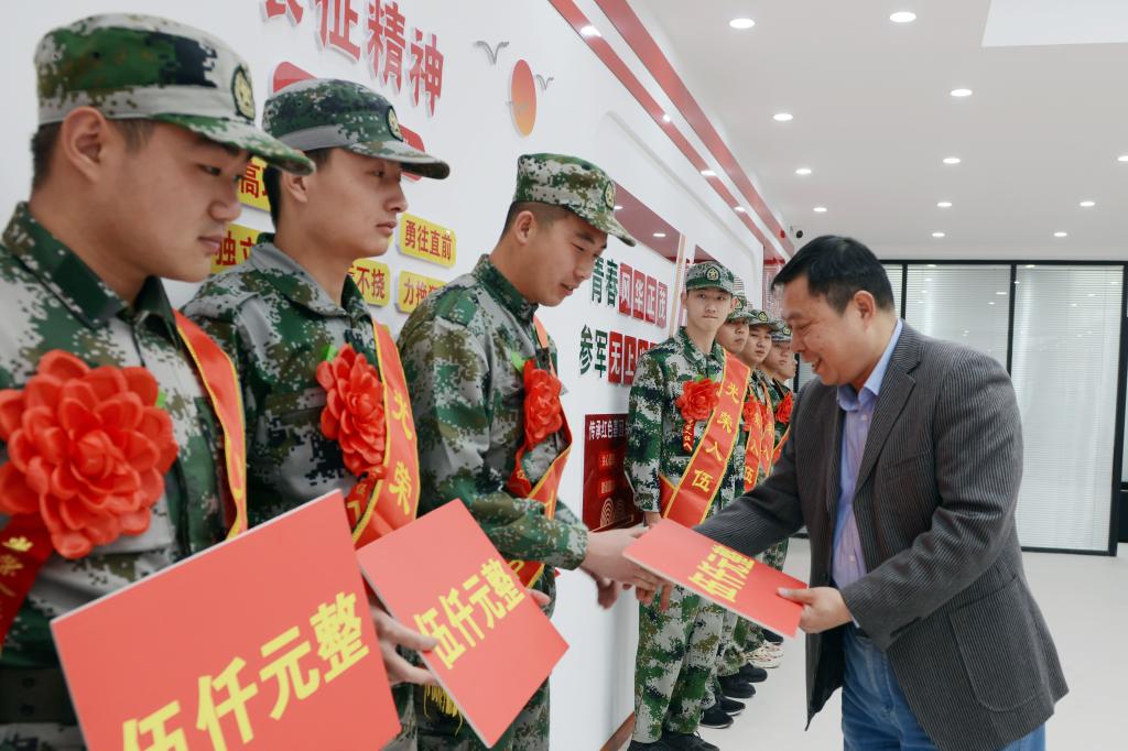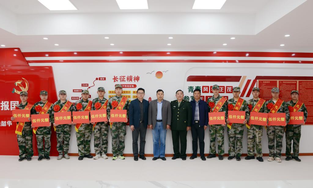欢送会上,鲁超为入伍大学生佩戴“光荣入伍”绶带和红花,向入伍大学生颁发入伍奖励金。