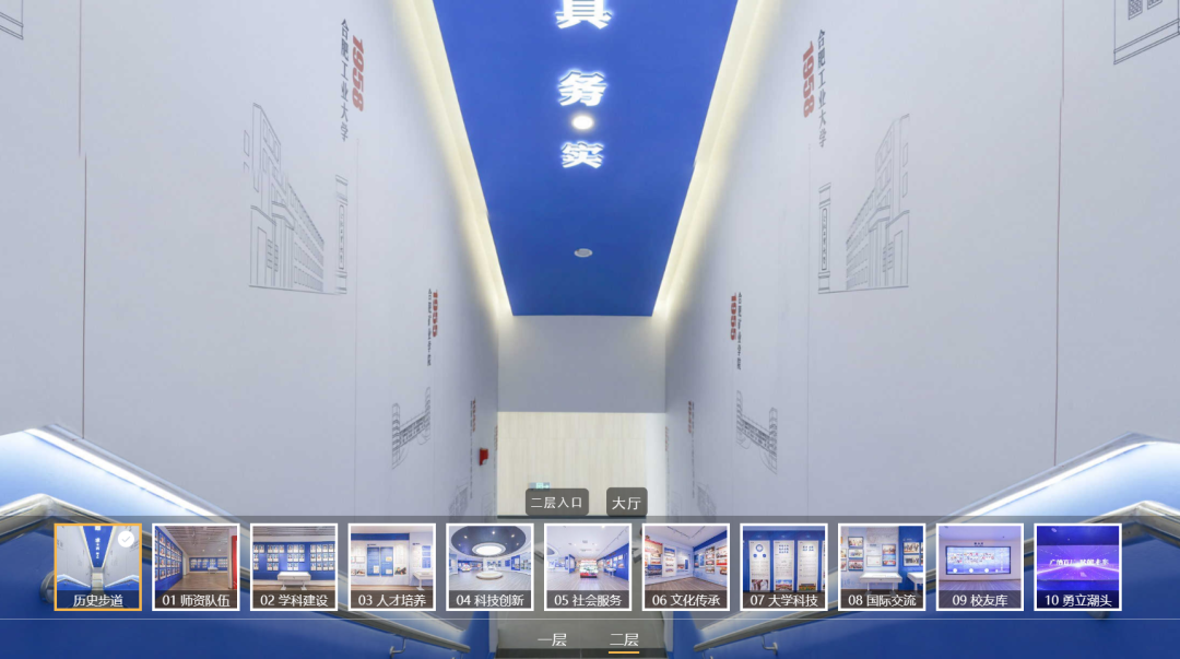 我校VR校史馆融合了虚拟现实仿真、实景三维建模、多元交融互动等高科技手段,把实体场馆近1500平方米展区予以全新呈现。观众只需轻动指尖,足不出户可随时随地线上“云游”校史馆,与历史和现场“一键链接”。