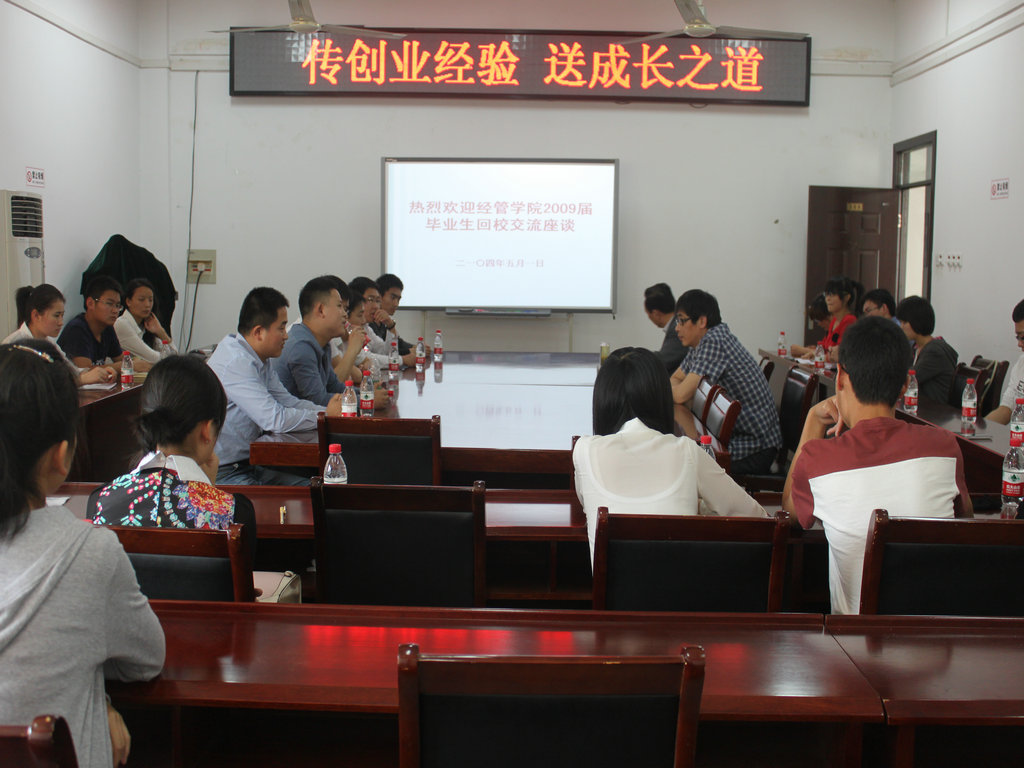 5月1日下午,在经济与管理学院3楼会议室,经济与管理学院2009届毕业生回母校与师生进行了一场以“传创业经验,送成长之道”为主题的交流座谈会。院党委书记崔跃武,行政秘书程少卿、院团委书记2009届学生辅导员耿家营出席本次座谈会,10多位经济与管理学院在校生参与座谈,座谈会由崔跃武主持。