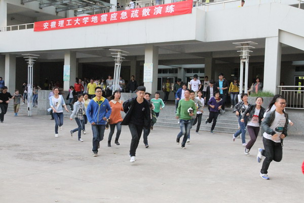 5月6日下午5:40,随着学校地震应急疏散演练指挥部总指挥、副校长王其东宣布演练开始,校园广播连续播报三遍:“现在地震来袭,请大家做好准备,各就各位,紧急避震”。刺耳的电铃、警报和哨声骤然响起。听到“地震警报”信号后,上课教师立即停止授课,告知学生“地震来了,不要慌,快避震”,并迅速打开教室前后门,保持通畅,关闭电源,指挥学生选择安全位置抱头蹲下。之后,随着“现在地震暂停,立即疏散”的指令响起,参加演练的学生在学生辅导员、教室管理员和保卫处工作人员等疏散引导员的指挥下,不到5分钟就自下而上、逐层、紧张有序地疏散到了避难场所。