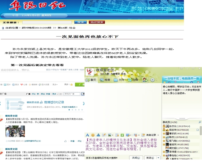 “青春暖人心,爱心构和谐”,2年零5个月、6个社区、10余个家庭,50余位老人,这些数字都和一个帮扶困难老人的爱心公益团体联系在一起,这就是暖阳爱老团。