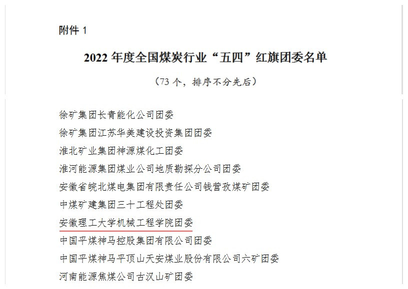 近日,全国煤炭行业共青团工作指导和推进委员会发布《关于表彰2022年度全国煤炭行业“五四”红旗团委(团支部)、优秀共青团员和优秀共青团干部的决定》,我校机械工程学院团委获评2022年度全国煤炭行业“五四”红旗团委。