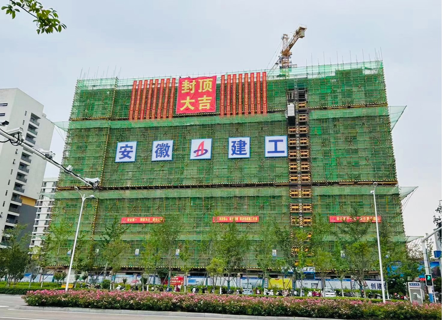 5月26日上午,研究生公寓4号楼B栋顶层屋面混凝土浇筑到位,标志着研究生公寓4号楼主体结构全部顺利封顶。