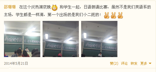 线上学习平台:外国语学院的班主任结合自身专业特长,发挥专业优势,在微博上收集英文短语表达与同学们分享,还利用微博定期开展英汉翻译比赛,学生们积极回复,踊跃参加,尽享线上第二课堂。