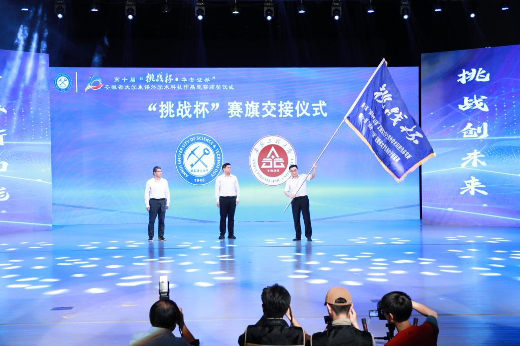 现场还进行了赛旗交接仪式,窦贤琨、董雨、郑健分别代表团省委、安徽理工大学、安徽工程大学完成交接。2024年第十一届“挑战杯”安徽省大学生创业计划竞赛将由安徽工程大学承办。