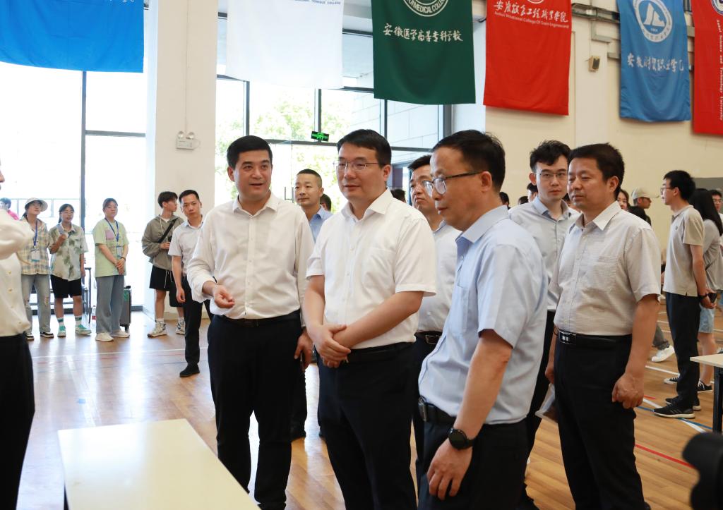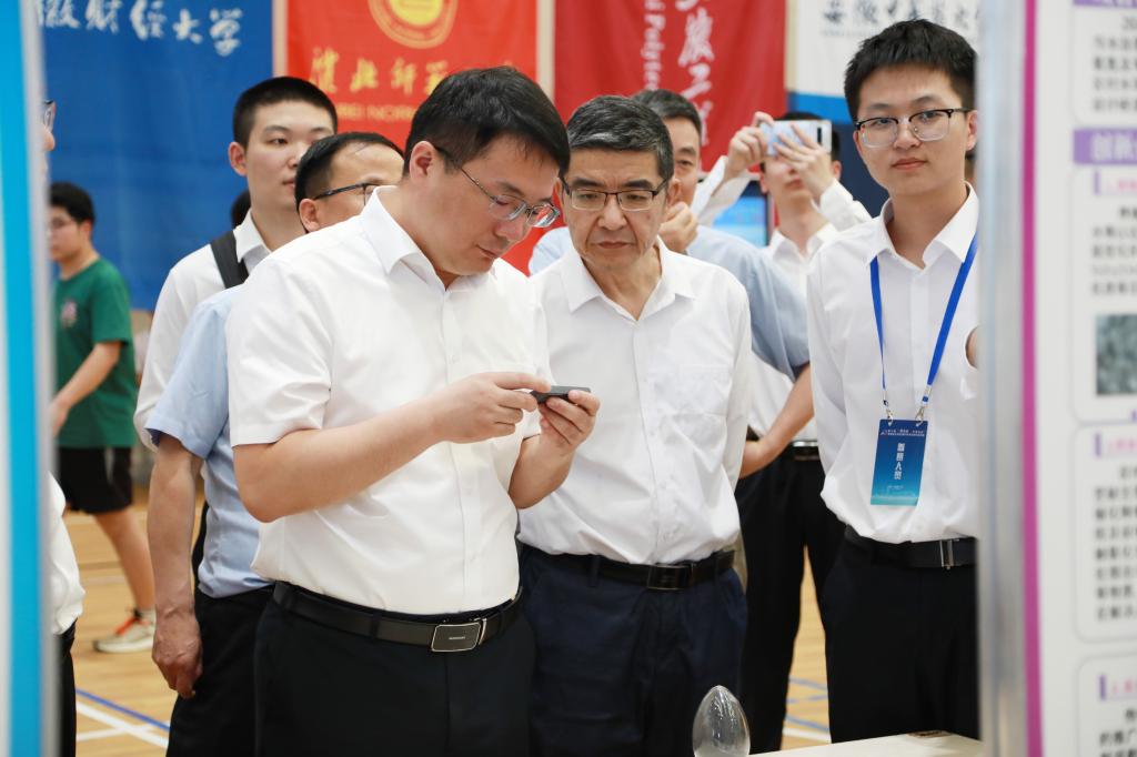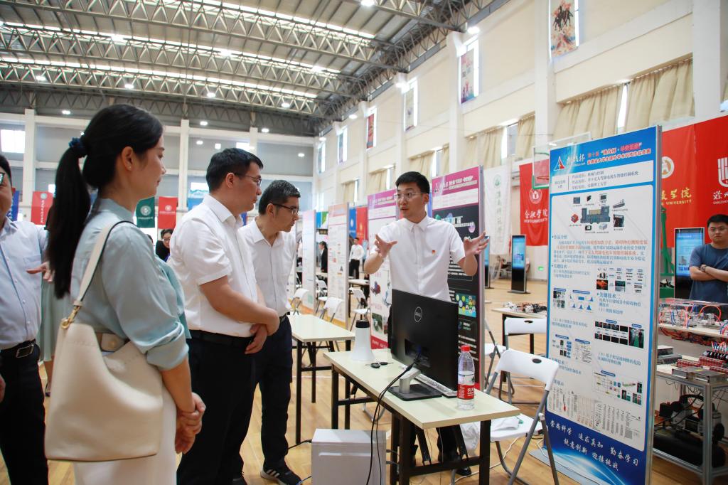 闭幕式前,陈明生、窦贤琨一行在董雨陪同下赴学校自强体育馆对参与本次“挑战杯”的作品巡展,并参观了16个地市团市委创新创业成果展。