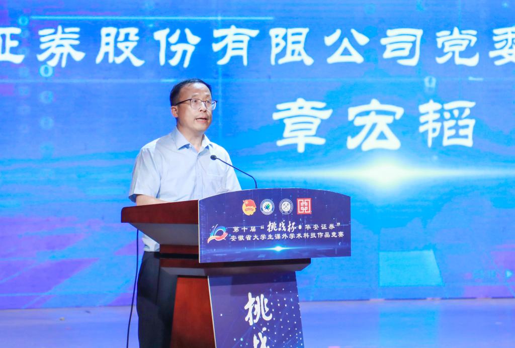 章宏韬在致辞中代表华安证券,向与会领导和全校师生对大赛的支持表示感谢!向大赛中取得优异成绩的团体和个人表示祝贺!他表示,本届“挑战杯”是科教兴国战略、人才强国战略、创新驱动发展战略的生动实践,取得了令人满意的成效,达到了一个新的高度。科技成果要实现产业转化,必须以金融为支撑,资本市场发挥着不可替代的作用。华安证券作为安徽省国资控股的上市券商,将责任、使命融于血脉,坚定不移服务于党的金融事业,始终注重立足安徽、深耕安徽、服务安徽,致力于赋能实体经济。近年来,华安证券通过多途径提升青年群体金融素养,促进科技成果转化,助力金融与科技、科技与投资的深度融合。华安证券将积极发挥桥梁纽带作用,助力更多的高校青年更好适应经济社会发展要求和成长成才需要。 希望各位选手在继续锻炼中练就过硬翅膀,在继续挑战中放飞青春梦想!祝愿大学生朋友胸怀“国之大者”、不断追求卓越,把青春融入中国式现代化建设和民族伟大复兴的事业!