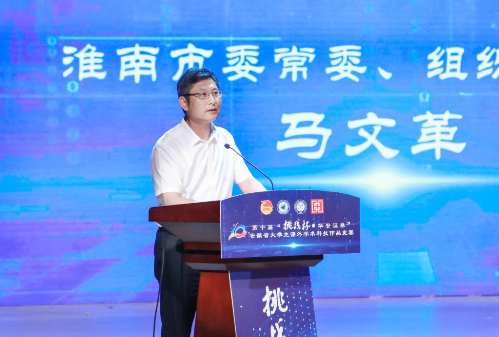 马文革在致辞中表示,“挑战杯·华安证券”安徽省大学生课外学术科技作品竞赛胜利闭幕,这是对安徽理工大学科创育人工作的肯定,也是对淮南市创新创业工作的有力推进。习近平总书记在党的二十大报告中强调“科技是第一生产力、人才是第一资源、创新是第一动力”。“挑战杯”正是广大青年大学生们追逐创新创业的梦想盛会、展示非凡才华的广阔舞台。希望广大青年学生能够以此次竞赛为契机,进一步坚定理想信念,以真才实学报效国家,服务人民;进一步增强“挑战”筑梦的锐气,努力践行承担党和人民赋予的时代使命;进一步增强开拓创新的勇气,培养勇立潮头的浩气,超越前人的勇气和与时俱进的朝气,在创新创造中超越自我。他指出,淮南是一座历史悠久的城市、是一座资源富集的城市、是一座交通便捷的城市、是一座宜居宜业的城市、更是一座渴求人才、渴求创新的城市,淮南市诚挚欢迎广大青年学生选择淮南、留在淮南、扎根淮南,与淮南携手奋进、共同成长。祝愿大学生朋友们在创新创业的大路上尽展才华,梦想成真,在实现中华民族伟大复兴的征程上,谱写出不负时代,不负韶华的青春乐章!