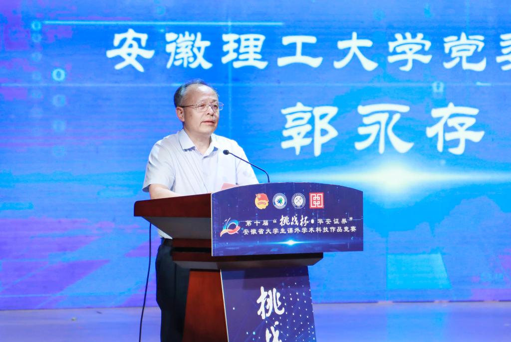 郭永存致辞。他代表大赛承办单位向获奖团队表示祝贺,向大赛组委会表示感谢,向参赛师生、评审专家、工作人员和志愿者表示敬意!他简要介绍了学校历史沿革并从“双一流”创建、“四个融入”发展战略、科研平台建设及招生就业等方面回顾了学校的办学成绩。郭永存表示,一直以来,学校坚持把大学生学科竞赛作为提升大学生创新能力的重要载体和有力抓手,构建起“赛前培育—赛中实践—赛后孵化”的完整体系,取得了一系列令人瞩目的成绩。他指出,“挑战杯”是当代大学生科技创新领域顶级赛事之一,是同学们磨砺创新品质、展示创新风采的重要平台。本届省赛是规格最高、规模最大、影响最广的一次全省性的大学生学术科技活动。为承办好这次大赛,学校全体师生竭力做好相关服务工作,为参赛师生提供一对一接待、场馆布置、赛事咨询、赛场引导、秩序维护等;比赛期间,学校展演了原创话剧《柴登榜》,举办了大学生草地音乐节、职场体验、科技强国“对话院士”等特色活动,力求给予参赛师生最美好的比赛回忆。郭永存表示,面向新征程,当代大学生是实现第二个百年奋斗目标参与者、生力军,希望同学们把充满激情、富于创新、勇于实践的劲头保持好,把“想法”付诸创造性的“实践”,在守正创新的青春赛场更加出彩,更好地服务现代化美好安徽建设,为加快实现高水平科技自立自强、加快建设科技强国贡献青春力量。