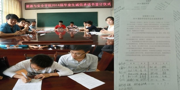 以贷款毕业生群体为重点,集中组织开展“四个一”活动:学校统一印发《生源地助学贷款还款指南》,进一步明确还款流程、诚信履约和违约责任,确保1139名贷款毕业生人手一份;学校统一印制《安徽理工大学2014届助学贷款毕业生诚信承诺书》,由各学院组织全体贷款毕业生集中学习承诺书并在承诺书上签字;校院两级分别邀请银行专业人员组织开展专题讲座,宣传普及征信、金融等相关知识,宣讲诚实守信事迹,倡导契约精神,促使学生树立诚信观念、增强法律意识,确保每一位贷款毕业生在离校前接受了一次征信与金融知识教育;及时组织并按规定流程为每一位贷款毕业生办理毕业确认手续,确保学生忠实履行贷款合同。
