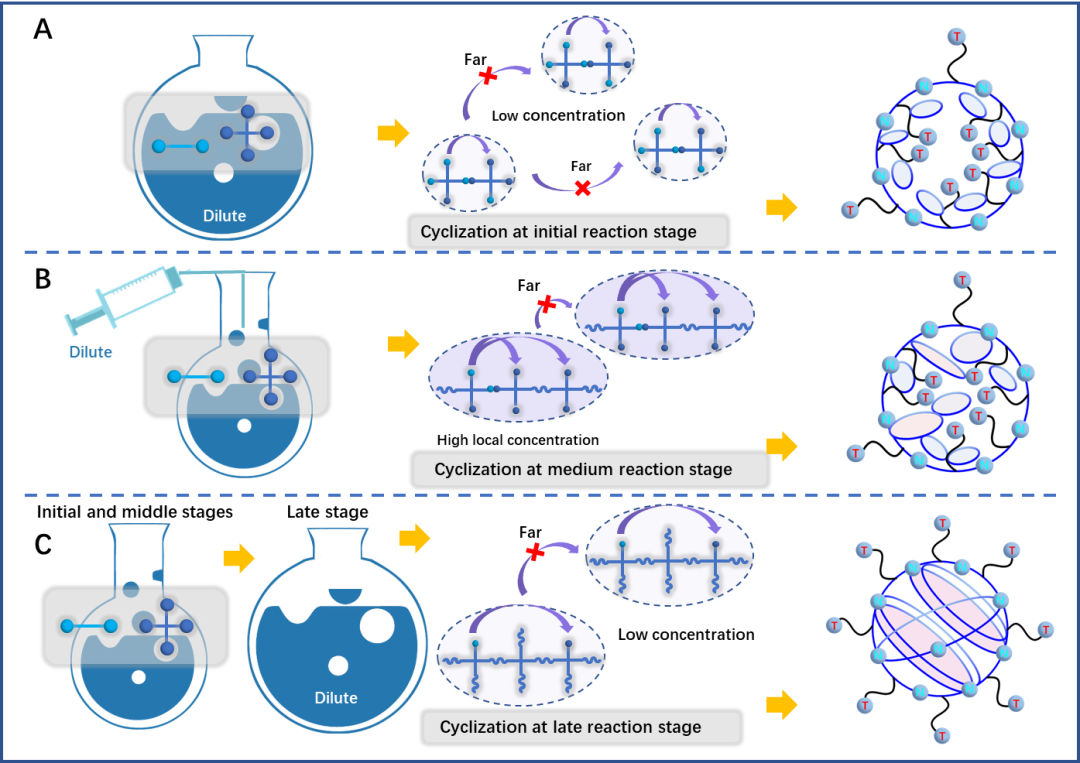 与此同时,聚合物的拓扑结构对基因传递效率至关重要,因此,探索新型聚合物结构作为基因传递载体引发了广泛兴趣。本研究提出了一种新型的环化阶段控制策略,可在不同步骤生长聚合(SGP)阶段调节环化倾向。这一策略实现了三种不同环大小和循环拓扑的三维多环聚(β-氨基酯)(CPAEs)的构建。首次利用荧光光谱和二维核磁共振谱验证了三种CPAEs的独特拓扑特性,包括不同环类型和末端基团空间分布等。其中A和B的环尺寸偏小,且末端基团被包埋在分子内;而C主要为大尺寸的环,末端基团悬挂在分子外侧。