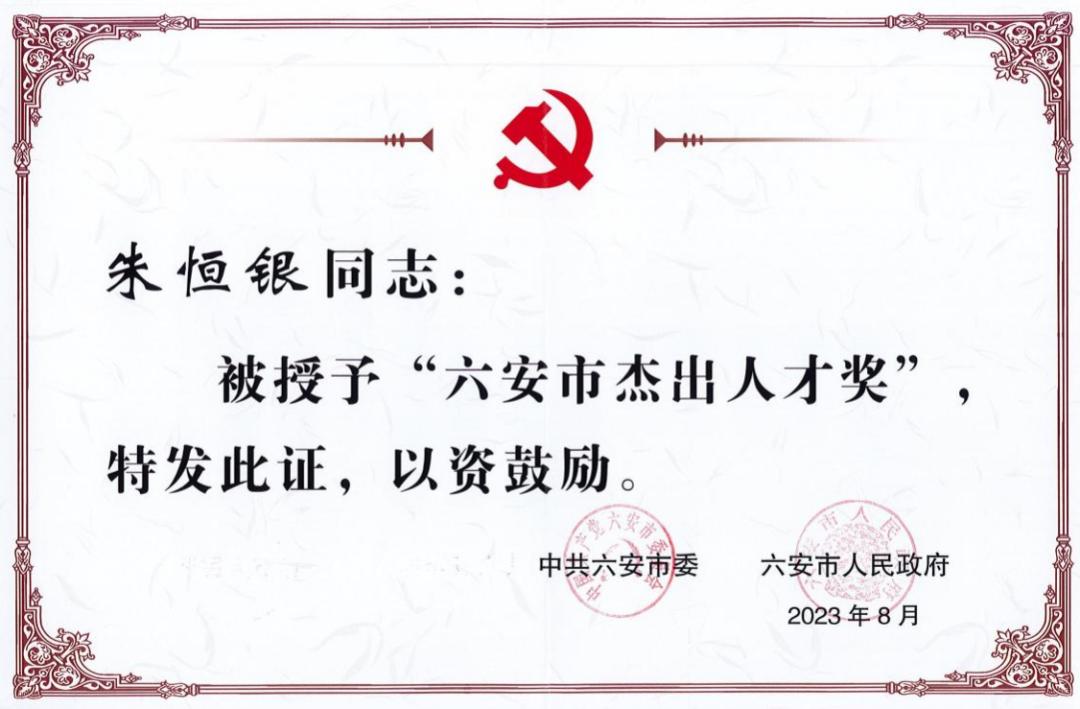 会上表彰了为六安经济社会发展做出突出贡献的优秀人才。为表彰和弘扬朱恒银教授扎根一线地质勘探工作46年,在服务地方社会发展、技术创新和人才培养等方面做出的杰出贡献,授予朱恒银“六安市杰出人才奖”。