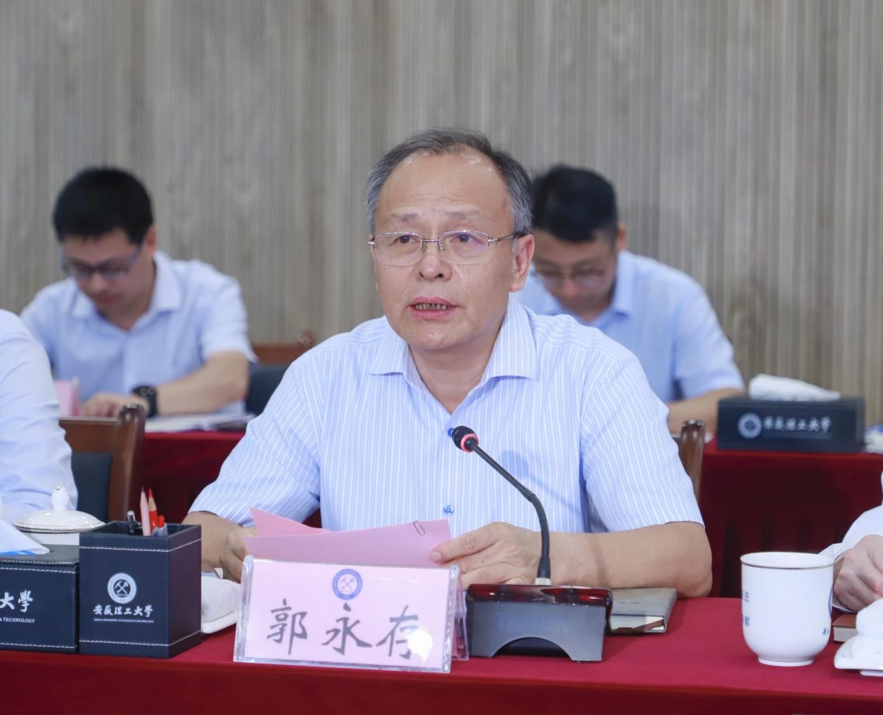 郭永存致辞。他代表学校对各位领导来校指导工作表示诚挚的欢迎,对战略合作框架协议的成功签订表示热烈的祝贺,对长期以来关心支持学校发展的各级领导表示衷心的感谢。郭永存指出,安徽理工大学缘煤而兴、因煤而强,建校以来坚守为党育人、为国育才初心使命,为能源领域培养了一大批顶尖科技人才、管理精英和企业翘楚,为煤炭行业攻克了一批关键技术,取得了一批原创成果。进入新时代,学校提出创建“双一流”大学宏伟奋斗目标,以“四个融入”发展战略为抓手,在高峰学科建设、科研创新、招生就业、服务产业创新发展等方面取得了丰硕成果,各项事业发生了深层次、格局性蝶变。他强调,今年是深入贯彻落实党的二十大精神的开局之年,校企此时签署战略合作框架协议,正逢其时、恰逢其势。我校将坚持以服务行业服务地方高质量发展为己任,以此次签约为契机,依托试点建设的省级卓越工程师学院,积极探索“产教融合、科教融汇”的人才培养模式改革“新范式”,推动拔尖创新人才培养与行业转型升级发展紧密结合、与区域经济社会发展紧密结合,奋力为我省三地一区建设和“七个强省”建设、为确保国家能源安全贡献力量!