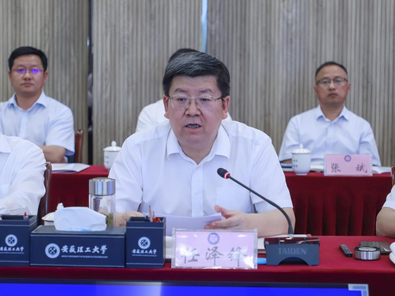 任泽锋讲话。他代表市委、市政府,向辛勤耕耘、默默奉献的安理大教职工致以诚挚问候和崇高敬意,向校企双方签署战略合作协议表示祝贺,对学校和企业长期以来关心支持淮南的发展表示衷心感谢。他指出,淮南的发展与学校、企业的发展是休戚与共、互相成就、共同成长的,始终坚持市校“一家人”。多年来,市委、市政府高度重视与安徽理工大学的交流合作,特别是近年来深入学习贯彻习近平总书记关于教育的重要论述,认真落实省委、省政府部署要求,在学校建设、人才引育、科技创新等方面,全力支持学校“双一流”大学创建。他强调,多年来,市委、市政府始终坚持市企“一家亲”理念,持续强化与煤矿企业的交流合作,始终坚持交流合作不止步。市委、市政府将借着此次校企达成战略合作的“东风”,进一步深化市校、市企之间的交流合作,真正把学校和企业当家人、当亲人,做好“服务员”,让大家在淮南安心发展、舒心生活。淮南市委、市政府将一如既往支持安徽理工大学发展提升,积极支持做好全国重点实验室、大学科技园、重点医疗项目等建设工作,也希望安徽理工大学充分发挥科创资源优势,吸纳鼓励更多企业参与大学科技园建设,在产学研合作、成果就地转化上取得新突破;充分发挥人才积聚优势,依托安徽理工大学高校工作站,大力引进高层次人才,引导更多毕业生留淮就业创业。淮南市委、市政府将一如既往支持在淮煤矿企业发展壮大,为企业生产经营、项目建设做好服务保障,也希望企业始终把淮南作为产业转型、投资兴业的首选之地,推动更多大项目、好项目落户淮南,不断开创合作共赢新局面。