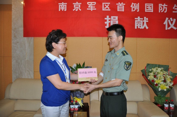 7月9日下午,我校国防生黄海松同学造血干细胞捐献仪式在安徽省立医院隆重举行。安徽省军区政治部主任孙进、安徽省委教育工委常务副书记高开华、我校副校长叶醒狮、南京军区政治部干部选培办副主任王一迪、安徽省红十字会秘书长孙齐云和南京军区驻安徽理工大学选培办主任辛崇波等出席捐赠仪式并亲切慰问黄海松同学及其家人。