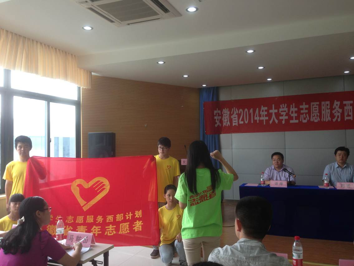 7月18日下午,安徽省2014年大学生志愿服务西部计划志愿者出征仪式在合肥学院隆重举行,团省委副书记周密,学校部部长谢海等出席仪式并为志愿者服务团授旗。来自各团市委、高校团委的相关领导以及近200名志愿者和带队老师参加了出征仪式。