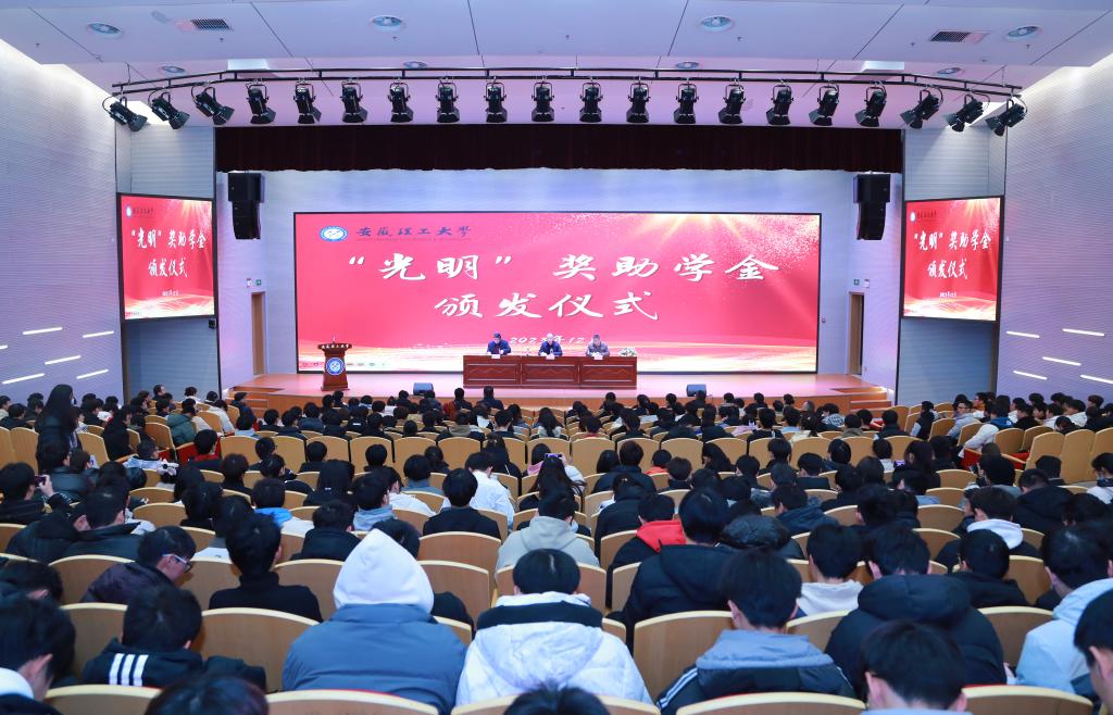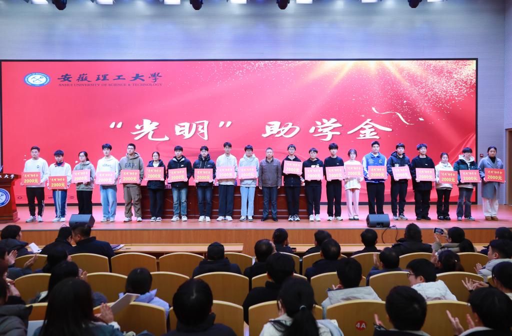 12月19日下午,安徽理工大学“光明”奖助学金颁发仪式在舜耕会堂隆重举行。校党委书记郭永存,“光明”奖助学金设立者、机制82级校友、东莞市科力线材技术有限公司董事长沈德才出席活动。仪式由校党委常委、副校长董雨主持。
