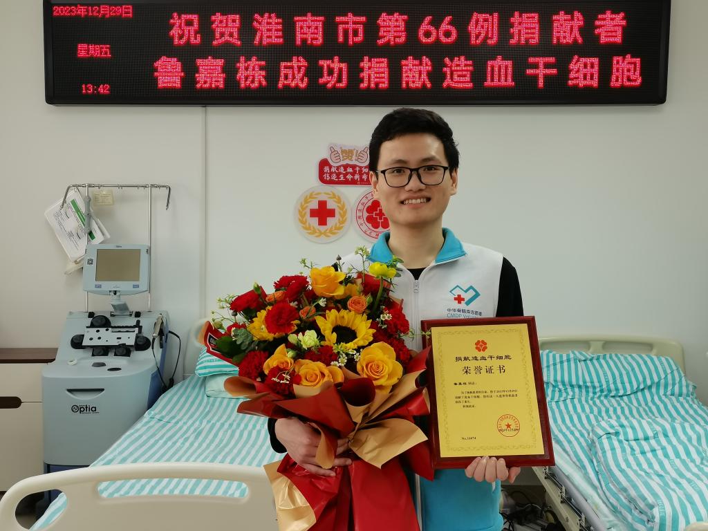 12月29日,从考研考场奔赴救命战场的安徽理工大学计算机科学与工程学院2024届本科毕业生鲁嘉栋,在安徽省立医院经过近5个小时采集,顺利捐献324毫升造血干细胞挽救外省一血液病患者的生命,他也成为我校第24例造血干细胞捐献者。时隔一个月,他和此前我校第23例造血干细胞捐献者赵智伟系同专业同学,一起留样,都给自己这一年和大学4年青春画上了最圆满的句号。