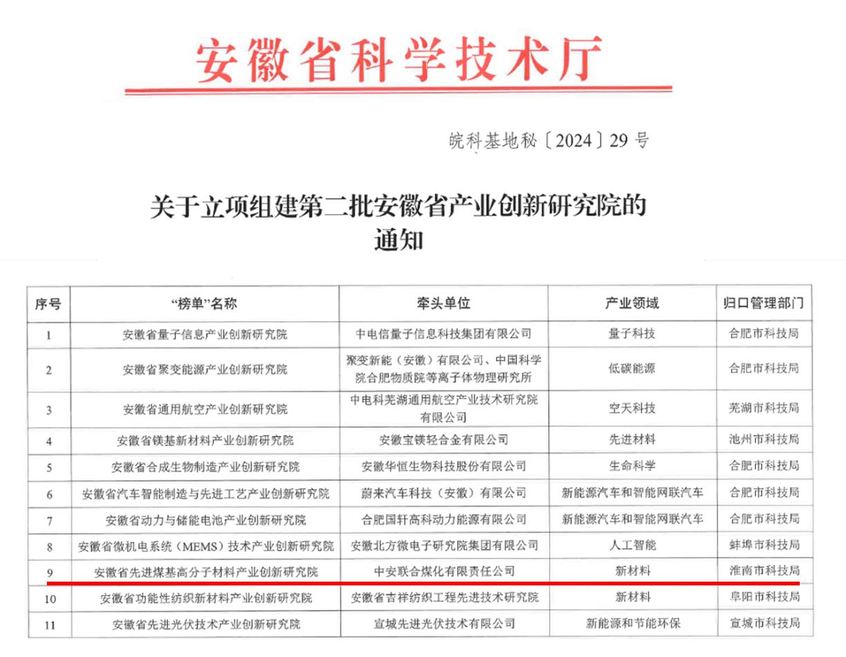 近日,安徽省科学技术厅发布了《关于立项组建第二批安徽省产业创新研究院的通知》(皖科基地秘〔2024〕29号),安徽省先进煤基高分子材料产业创新研究院成功获批。该产业创新研究院由中安联合煤化有限责任公司牵头,安徽理工大学、四川大学、江苏集萃先进高分子材料研究所共同建设。