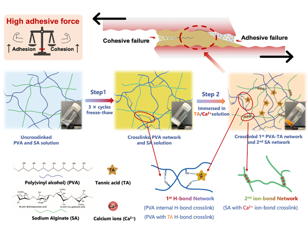 该团队首先利用单宁酸(TA)增强的聚乙烯醇(PVA)创建了一个高粘性网络,并利用钙离子(Ca²⁺)交联的海藻酸钠(SA)形成第二个互穿地性能调控的网络。通过精细调整这两种网络的比例,该团队成功地制备出了一种内聚力与粘附力平衡的高性能DN水凝胶粘合剂(参见图1)。与传统非平衡的水凝胶粘合剂相比,这种新型粘合剂的粘附强度提高了三倍(如图2所示)。此外,这种水凝胶不仅展示出了在多种物体表面上卓越的粘附能力,还具有出色的抗菌效果以及良好的细胞相容性。该研究为设计新一代内聚力与粘附力平衡的水凝胶强粘附剂提供了新的思路。