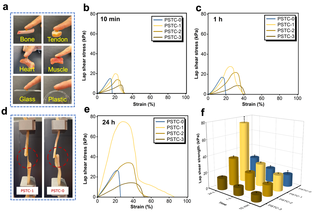 图2.PSTC水凝胶的粘附特性。(a) PSTC水凝胶对各种物体(包括组织、玻璃和塑料)的粘附性;(b) PSTC水凝胶在猪皮粘附试验中接触10分钟后的搭接剪切应力-应变曲线;(c) PSTC水凝胶接触1小时后的搭接剪切应力-应变曲线;(d) PSTC-1和PSTC-0水凝胶粘合剂搭接剪切试验的代表图像;(e)接触时间为24小时的PSTC水凝胶搭接剪切应力-应变曲线;(f)猪皮粘合试验的搭接剪切强度汇总图像
