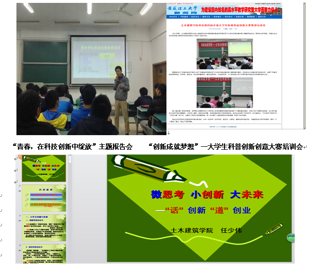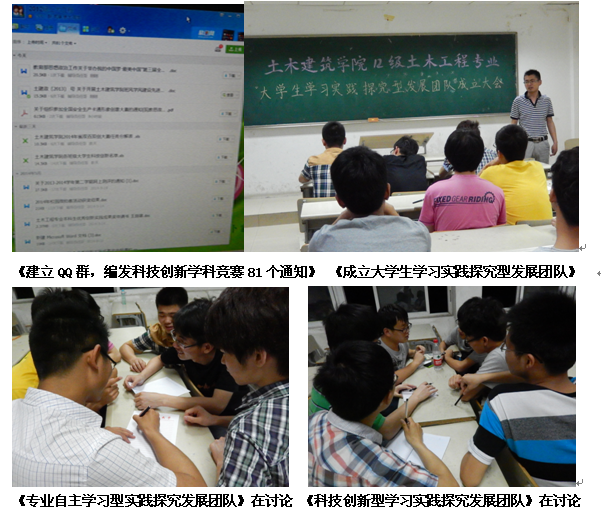 土木建筑学院历来高度重视学生创新工作,积极营造学生科技创新良好氛围。2012年10月,2012级土木工程专业10个班中,遴选具有创新创业精神具备科技创新、学科竞赛、文体等方面潜力的学生,组建4支“探究型学习发展团队”。针对高等数学、大学英语、理论力学等专业核心课程成绩优异学生成立“专业自主学习型实践探究发展团队”,主要参加全国大学生数学建模竞赛和全国周培源大学生力学竞赛等赛事;针对具有较强科技创新潜能的学生成立“科技创新型学习实践探究发展团队”,主要参加全国大学生“挑战杯”大赛和全国大学生节能减排与实践大赛、全国大学生创新创业训练计划项目等赛事;针对具有“商业头脑”,喜欢做“小生意”学生成立“自主创业型学习实践探究发展团队”,主要参加全国大学生创业计划大赛、全国大学生电子商务“创新创意创业” 挑战赛、全国管理决策模拟大赛等赛事;针对文体方面有特长和潜质的学生成立“文体竞技学习实践探究发展团队”。