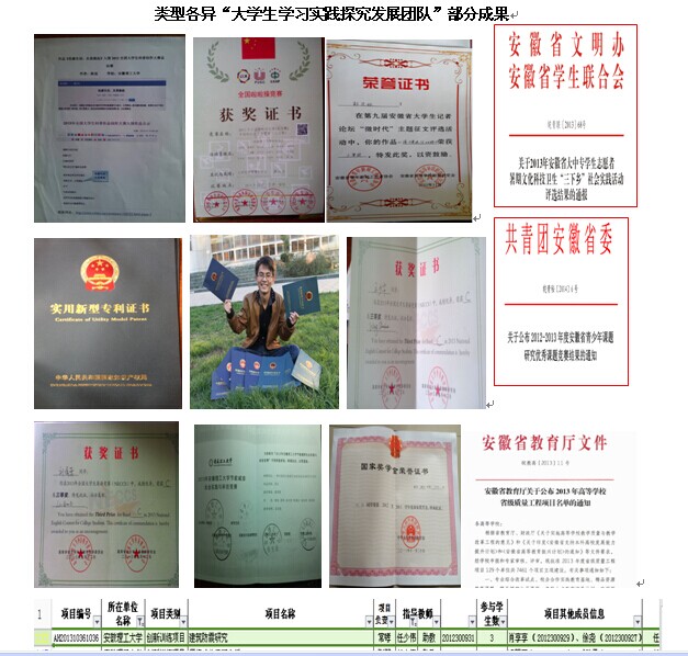 自“探究型学习发展团队”成立两年多来,取得了不错成绩。2012年11月-2014年10月,学生荣获国家级、省级、校院级科技与学科相关竞赛奖项78项。其中,1人获“中国大学生自强之星”,获全国大学生科普创新作品大赛入围奖2项(入全国20强),10人分别获第七届“认证杯”数学中国数学建模网络挑战赛全国比赛第一阶段、第二阶段二、三等奖,2人获“2014高教社杯”全国大学生数学建模竞赛安徽赛区三等奖、1人获第五届全国大学生数学竞赛省级二等奖;获批省级大学生创新创业训练计划项目10项,申报安徽省双百科普大赛作品19件,2013年申报校大学生科研项目8项,获批1项,2014年获批校大学生科研项目3项,1人获“”团中央学习团的十七大精神微博大赛全国一等奖,1人被校推荐“全国少数民族优秀大学生”候选人,1人获安徽省百所高校百万大学生科普创新创意优秀志愿者,1人获全国大学生数学竞赛安徽赛区二等奖,3人获全国大学生英语竞赛三等奖;1人荣获校第六届“挑战杯” 大学生创业计划竞赛铜奖,1人获第四届江南化工杯校创业计划大赛铜奖、1人获校第一届生态文明创意设计大赛“创意设计类”作品一等奖,1人获校节能减排社会实践与科技竞赛优秀奖;1人分别获2013年全国啦啦操联赛街舞第八名、全国啦啦操联赛总决赛花舞第三名;1人获安徽省大学生记者论坛征文比赛三等奖。