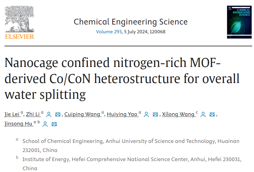 设计和制造一种具有新型结构的高效电催化剂对于电解水制氢具有深刻的意义。团队重点关注纳米级催化剂结构和功能属性,通过配体交换策略用三唑配体(MAT-6)表面修饰ZIF-67前驱体,通过热处理将Co/CoN异质结构纳米粒子限制在氮掺杂碳纳米笼中。所得电催化剂在碱性介质中的全水解反应中表现出出色的电催化性能,在1 M KOH电解质中分别具有115 mV和290 mV的过电位达到10 mA·cm2。此外,该电催化剂在24小时恒电位电解水分解过程中电流衰减仅为2.16%。密度泛函理论(DFT)计算显示异质结构Co/CoN之间的协同效应,加速了界面电荷转移和提高了材料的电导率,这是导致催化剂优良的电催化性能的主要原因。相关研究成果以“Nanocage confined nitrogen-rich MOF-derived Co/CoN heterostructure for overall water splitting”发表在Chemical Engineering Science293(2024)120068.