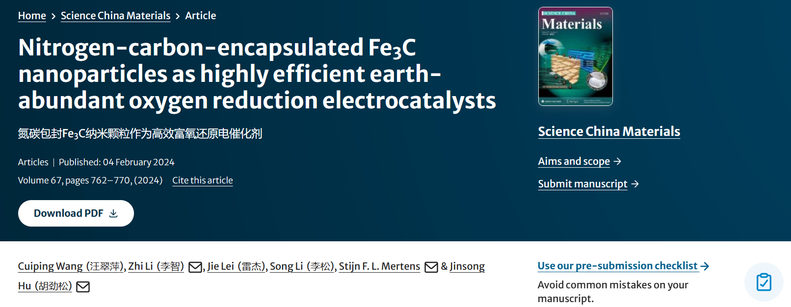 此外,团队设计和制备一种具有新型结构的高效电催化剂,通过用二茂铁甲酸修饰ZIF-8前驱体的表面,经过两步碳化工艺,将热解Fe3C纳米颗粒(NPs)封装到碳纳米管(CNTs)中以及将Fe单原子隔离到N掺杂碳(NC)基体。优化后的Fe3C@CNT/NC-M具有高的ORR电催化活性,其E1/2= 0.941 V vs。可逆氢电极(RHE),在0.1 mol L−1KOH溶液中JL= 6.31 mA cm−2。此外,使用Fe3C@CNT/NC-M作为空气阴极组装的一次锌-空气电池在420 mA cm− 2下的开路电压(OCV)为1.525 V,功率密度高达348 mW cm– 2。相关成果以“Nitrogen-carbon-encapsulated Fe3C nanoparticles as highly efficient earth-abundant oxygen reduction electrocatalysts”发表在Science China Materials67(2024)762-770.