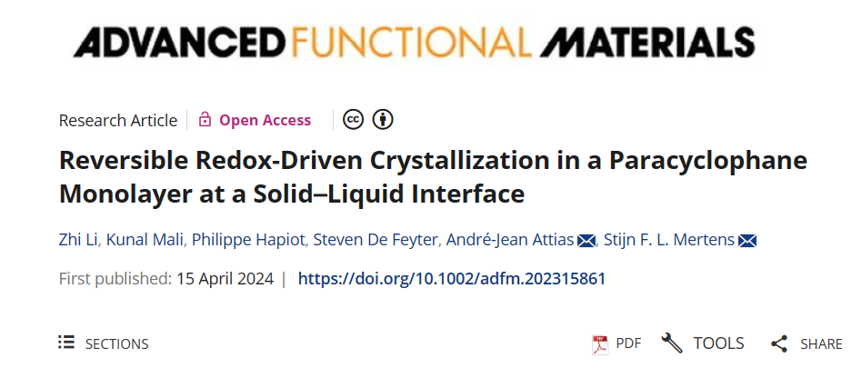 将三维Janus结构有机分子融入未来功能材料需要详细理解其性质、相行为,特别是结构与功能之间关系的物理化学原理。李智博士通过电化学的方式调控含有二茂铁的三维Janus构建单元(M-Fc)的结晶方式。使用扫描隧道显微镜(STM)成功地可视化M-Fc分子吸附层的二维结晶结构。表面限定的氧化还原过程驱动从可见的二维有序线状相(M-Fc0,以二茂铁为中性状态)到不可见的类气体吸分子附层(具有高移动性的M-Fc+)之间的相变。此外,通过电化学扫描隧道光谱学(STS)研究了分子吸附层的电子器件行为。这些结果突显了这类三维Janus的功能潜力,它们可以在驱动器、光学晶体和其他智能材料中发挥重要的作用。相关研究成果以“Reversible Redox-Driven Crystallization in a ParacyclophaneMonolayer at a Solid-Liquid Interface”发表在Advanced Functional Materials,(2024)2315861.