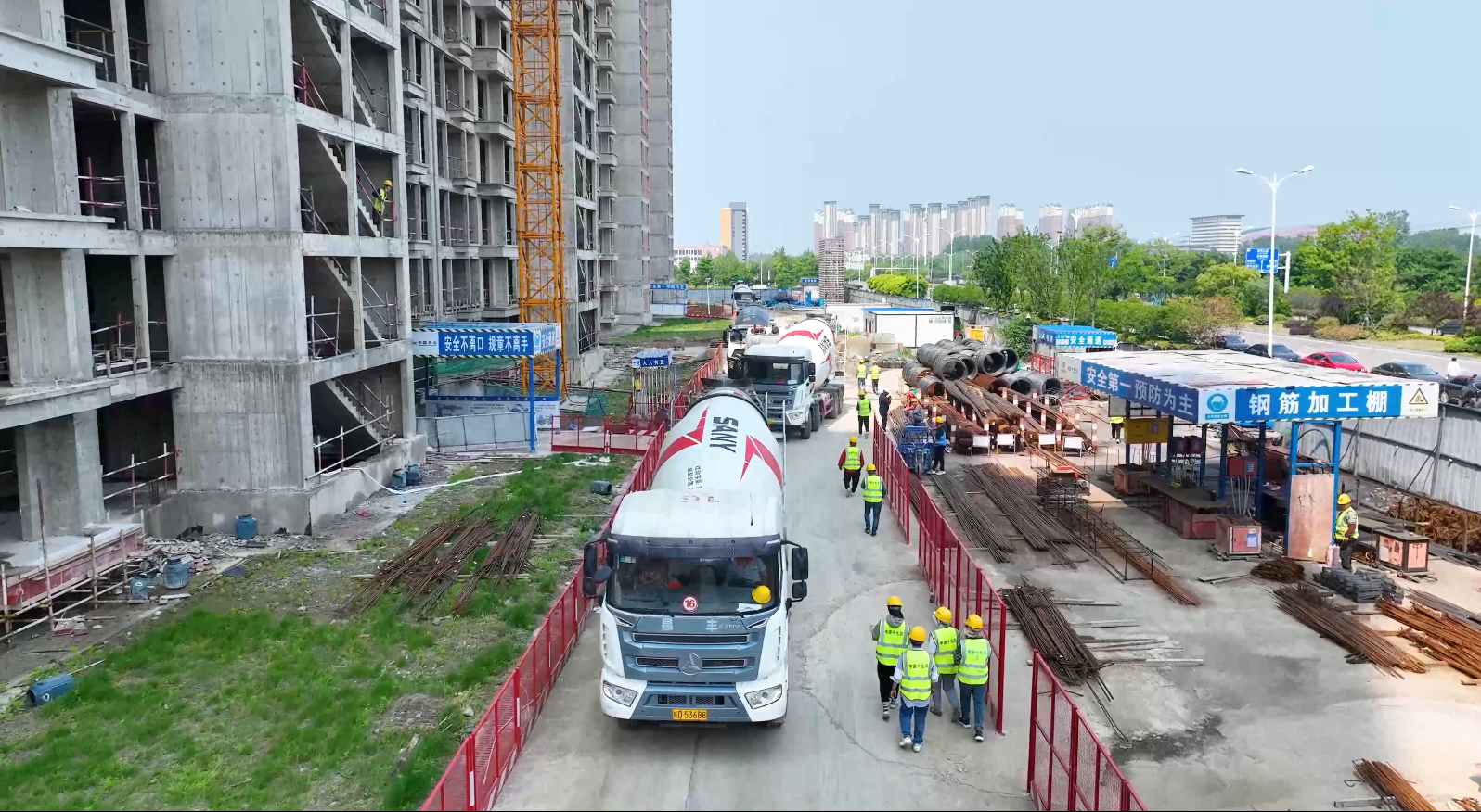 车辆穿梭、机器轰鸣,项目施工现场一派热火朝天的繁忙景象,400多名工人正紧张忙碌的进行施工作业,铆足干劲抢工期、赶进度、忙生产、保安全,确保高效率、高质量、高品质完成任务目标。