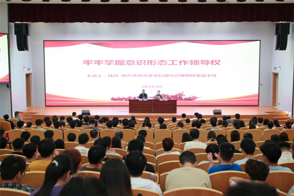 5月9日下午,学校在舜耕会堂举办百川大讲堂,邀请中共淮南市委党校现代管理教研室副主任,副教授陆丹作题为《牢牢掌握党对意识形态工作领导权》的专题报告,报告会由校党委常委、副校长董雨主持,全校师生400余人参加报告会。