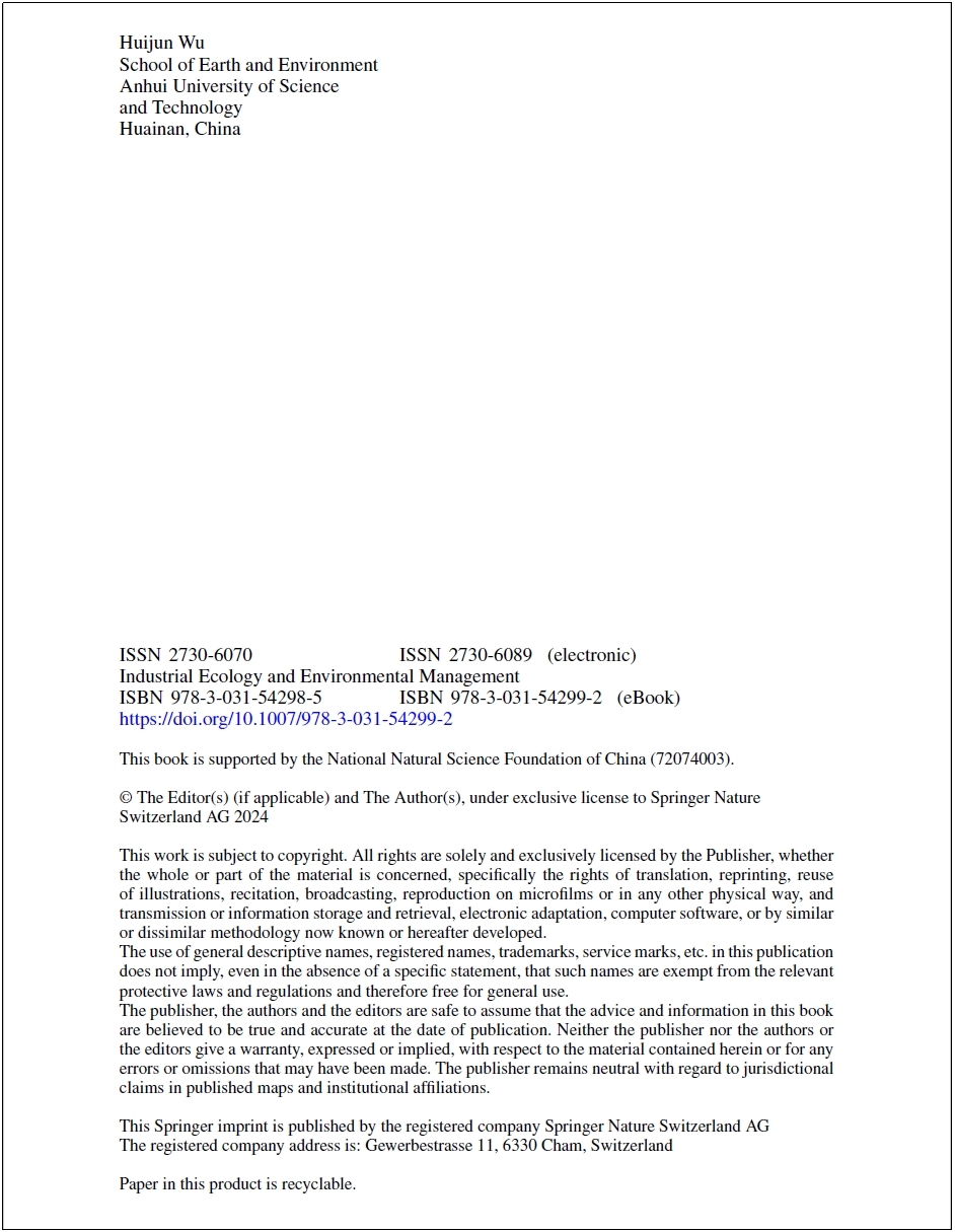 由我校地球与环境学院武慧君教授独撰的著作《Material Flows with Nexus of Regional Socioeconomic System》(区域社会经济系统物质耦合代谢),于2024年5月在国际知名学术出版社Springer Nature(施普林格·自然集团)出版发行。该著作共九章,约60万字,系统性地阐述了区域社会经济系统中的物质代谢及其耦合关系造成的环境影响,是我校第一部由SpringerNature面向全球出版发行的专著,体现了国际著名学术出版机构对我校在区域可持续发展与物质代谢方面研究成果的高度认可。