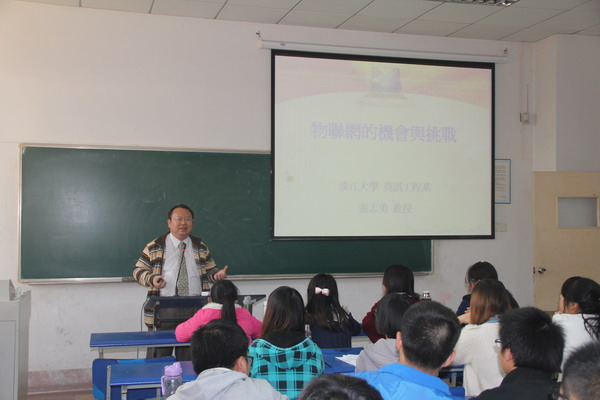11月4日,台湾淡江大学张志勇教授应校科技产业处、计算机科学与工程学院邀请来我校讲学,在新教1303作了题为《物联网的机会与挑战》的学术报告。报告会由院长李敬兆教授主持,计算机科学与工程学院2012级电子仪器和物联网专业的学生聆听了报告会。