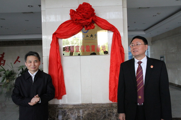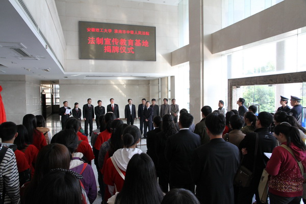 11月6日下午,安徽理工大学法制宣传教育基地在淮南市中级人民法院揭牌。校党委副书记王洪,淮南市中级人民法院党组书记、院长宋长士签署了法制宣传教育基地的建设协议,并共同为基地揭牌。揭牌仪式由市中级人民法院政治部主任查政权主持。校党委常委、校党委宣传部部长吴照明,毕业生就业工作处处长谢振安,思政部主任徐其清,外国语学院副院长王宗华,党委宣传部副部长虞尚元,市中级人民法院法官管理处、宣传教育处等单位领导出席了揭牌仪式。我校师生代表和市中级人民法院法官代表近100人参加了揭牌仪式。