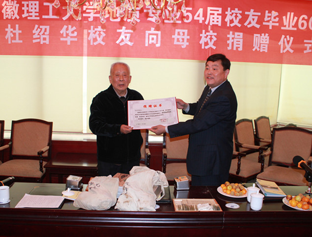 杜绍华亲切回忆了60年前的学校生活,感念当年自己意外受伤、家庭经济困难而面临辍学,母校老师和同学伸出援助之手,无私关心、热情帮助,自己才得以恢复健康并顺利完成学业。抚今追昔,他激动不已,泪流满面。他讲述了香花石的发现和命名过程,介绍了绿色含铍条纹岩等稀有矿石的分布和储量情况。他表示自己今天取得的成绩离不开母校老师和同学的帮助,一定要将自己毕生的专业研究成果和珍贵收藏捐给母校,为母校的发展贡献绵薄之力。