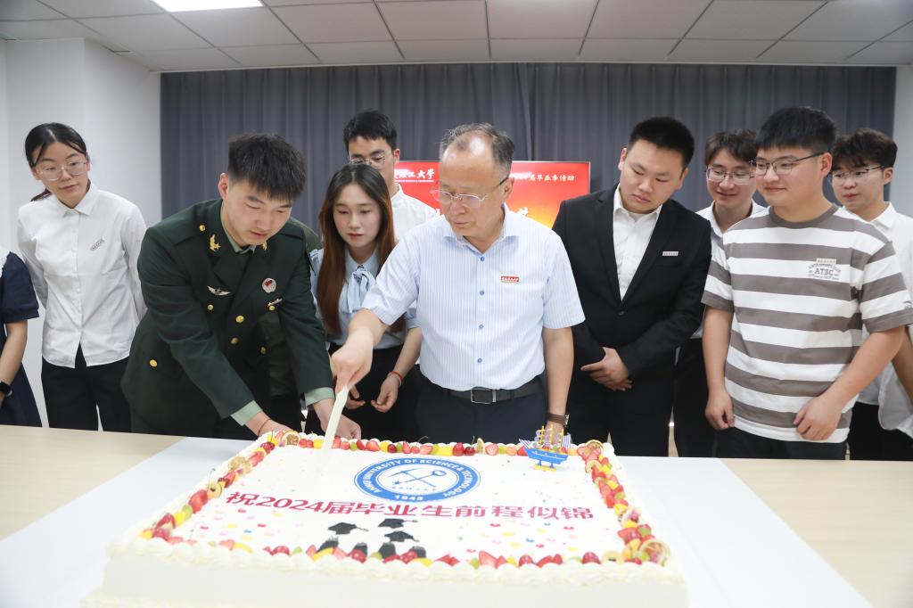 茶叙后,郭永存向毕业生代表赠送《习近平与大学生朋友们》《习近平讲党史故事》《中国哲学简史》和《乡土中国》等书籍,并与毕业生代表共切毕业蛋糕。