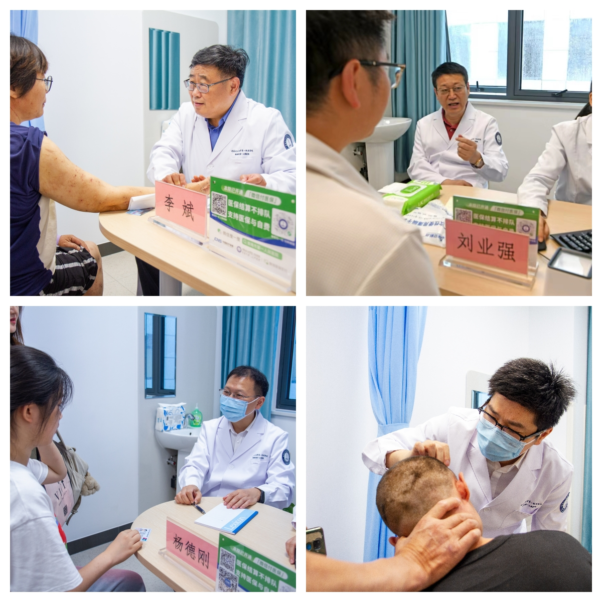签约授牌仪式后,上海市皮肤病医院(同济大学附属皮肤病医院)院长李斌教授、皮肤病理科刘业强教授、光医学治疗科张国龙教授、麻风感染科杨德刚教授、医疗资源发展部汪青良教授、皮肤外科二科赖永贤教授等国内知名皮肤病“大咖”专家汇聚医院一附院南区门诊一号楼,现场为患者开展义诊活动,很多慕名而来的患者提前来院挂号排队,有序等待就诊。 专家们耐心细致地为前来咨询的患者进行皮肤检查,仔细询问他们的身体状况和生活习惯,并根据检查结果给予相应的治疗建议和健康指导,特别是为一些皮肤肿瘤、银屑病、荨麻疹等难治性皮肤疾病提供了个性化的诊疗方案,当天下午义诊活动接诊患者300余人次,患者均满意而归。