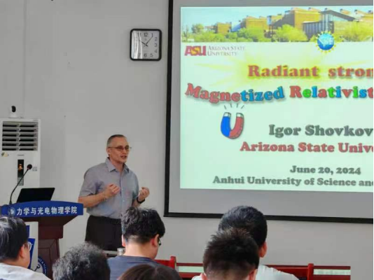 应科研部、国际交流与合作处和力学与光电物理学院邀请,6月20日上午,美国亚利桑那州立大学Igor Shovkovy教授来我校做学术交流,并作题为《Radiant strongly magnetized relativistic plasmas》的学术报告。报告会由力物学院主要负责人主持,学校部分教师和研究生参加了此次报告会。