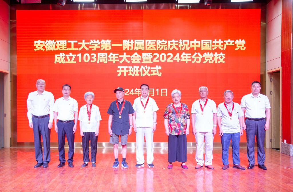 鲁超和一附院负责人为“光荣在党50年”老党员代表赵世培、张忠义、陈守英、王敏华、庞良田、蔡瑞君等同志颁发纪念章。全体参会人员观看了纪录片,共同回顾中国共产党成立103年来辉煌历程,感悟伟大的建党精神;青年党员们献唱多首经典红歌,感染了在场的每一位参会人员,大家不约而同共同吟唱,在歌声里祝福伟大的党、伟大的祖国繁荣昌盛、国泰民安!