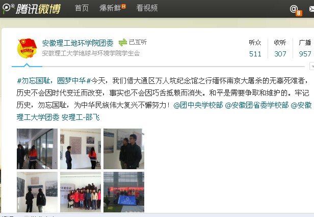 当日上午,学院团委组织学生骨干前往安徽省爱国主义教育基地——大通“万人坑”开展教育实践活动。凝视着定格的历史画面,同学们看到了日本帝国主义侵略中国的罪行,心灵受到震撼,一股强烈的爱国主义热情在同学们的心中油然而生。同时,学院团委通过发布“国家公祭日”专题微博,号召同学们以史为鉴,勿忘国耻,积极扩大爱国主义教育活动的影响力。