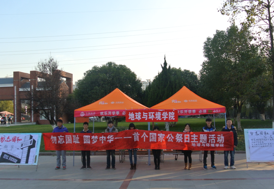 以全国首个公祭日作为教育契机,地球与环境学院开展一系列爱国主义教育活动,进一步激发了大学生的爱党爱国情怀,让爱国不仅仅是体现在大学生的思想上,更体现在大学生具体的行动中。