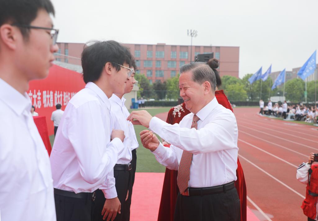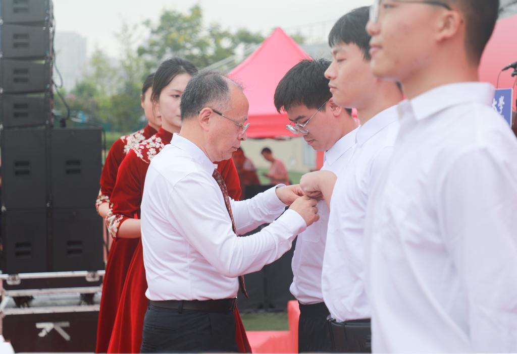 袁亮为新生代表佩戴校徽