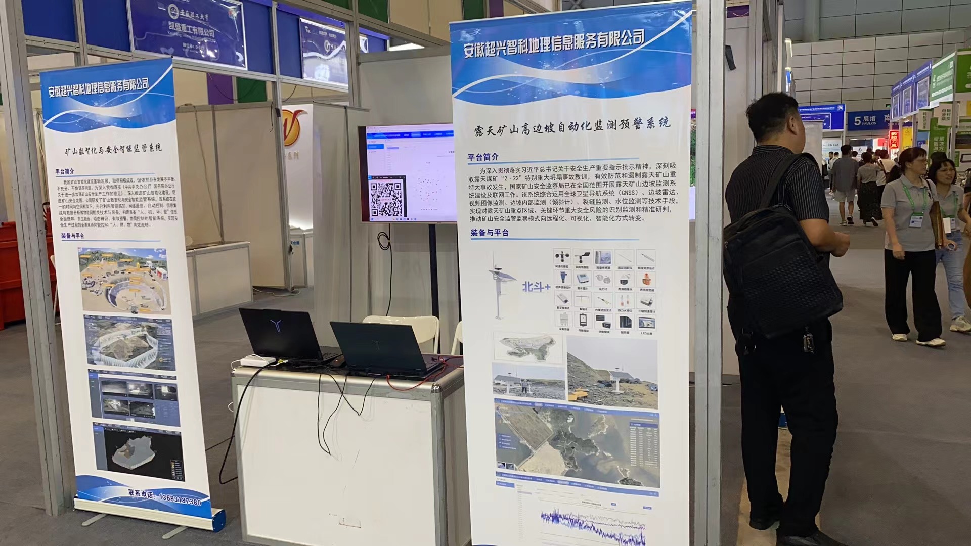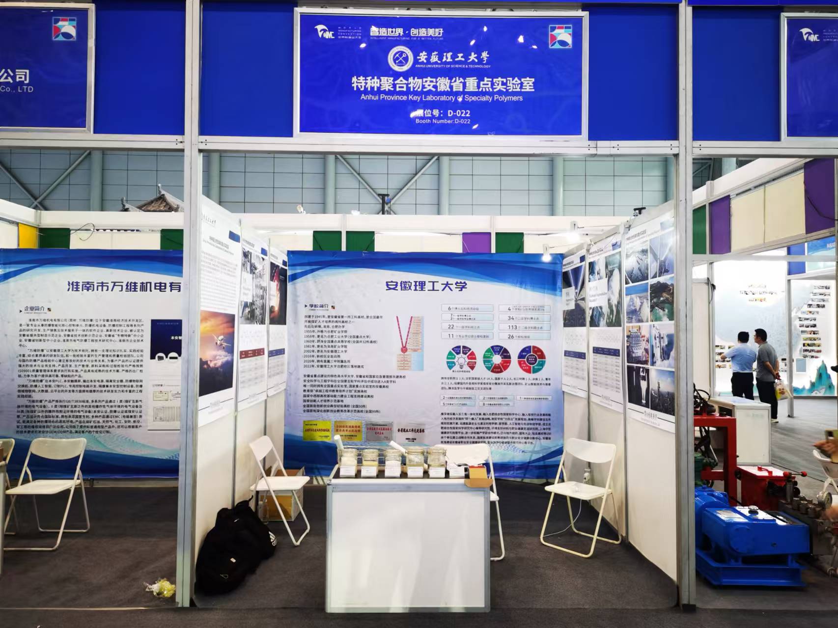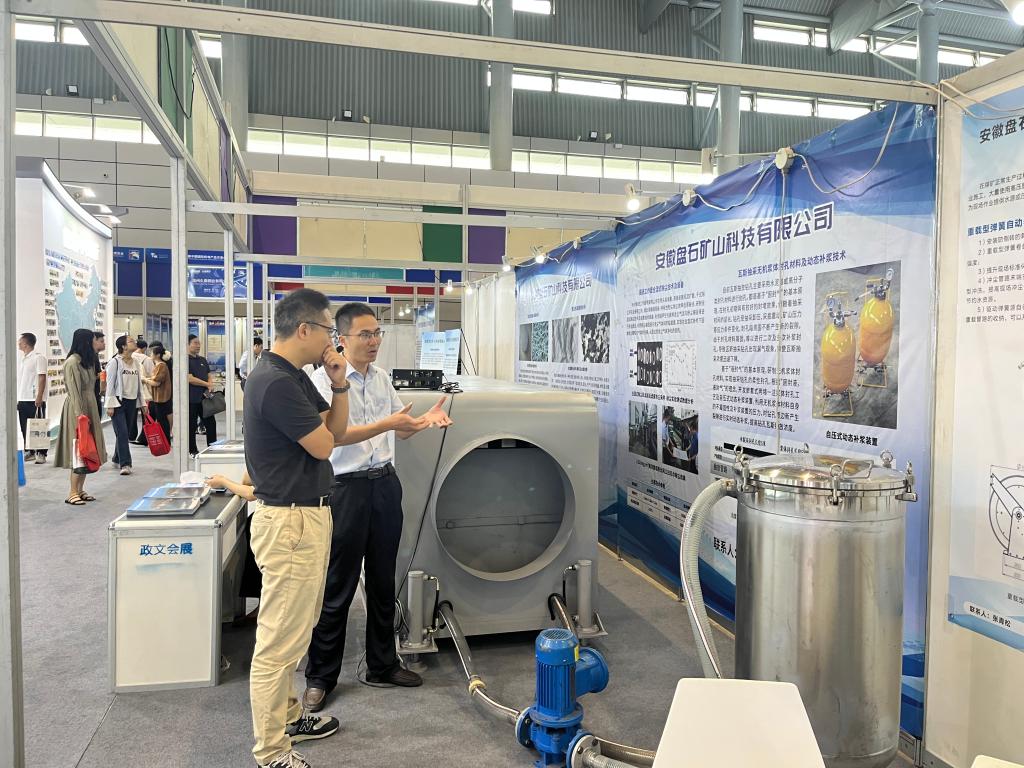 主题展上,重点推介了我校与凯盛重工有限公司、万维机电有限公司、特种聚合物安徽省重点实验室、安徽盘石矿山科技有限公司、淮南赤阳智能精选科技有限公司、安徽高谐智能科技有限公司、安徽超兴智科地理信息服务有限公司等7家企业合作研发的科研装置及相关理论成果。其中,煤矿井下磨料水射流切割锚索装置、矿用隔爆兼本安型PLC控制箱、高性能高分子材料(聚砜、聚醚砜、聚苯砜、磺化聚苯砜)、矿山自动化安全监测系统、数字化矿山平台、掘进工作面全湿式除尘装置、HDS电气设备在线监测系统、力敏传感器及检测系统等十余项展品,得到了参会嘉宾高度认可;各展台详细介绍了我校在矿山安全领域的理论成果、技术创新、产品应用、市场价值、合作信息等。