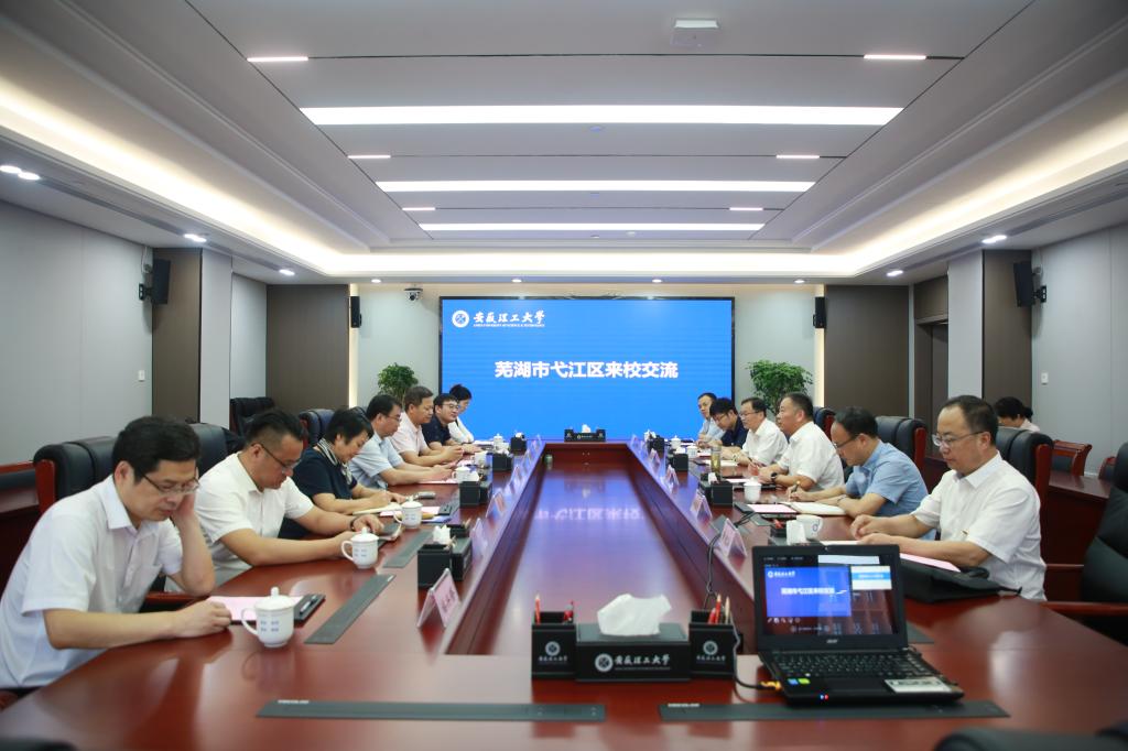 9月26日上午,芜湖市弋江区区委副书记、区长汪敏一行来校调研交流。校党委常委、副校长宫能平会见了汪敏一行,并与来宾进行座谈交流。弋江区副区长张科出席座谈会。