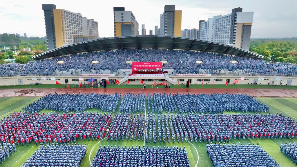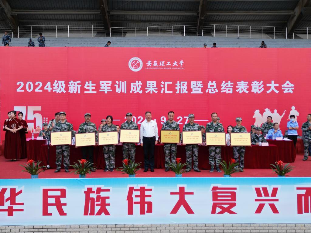 9月27日上午,学校2024级新生军训成果汇报暨总结表彰会在淮南、合肥两地同步举行。参训学员身着戎装,以严整的军容、饱满的精神展示军训成果。校党委常委、副校长、校军训工作领导组副组长宫能平、王先江,承训部队驻校首长出席活动。