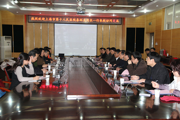 2月2日下午,上海市第十人民医院院长秦环龙、副院长李济宇等一行7人来我校访问交流。校党委书记颜事龙、校长郭永存在校本部图北会议室亲切会见了来宾。