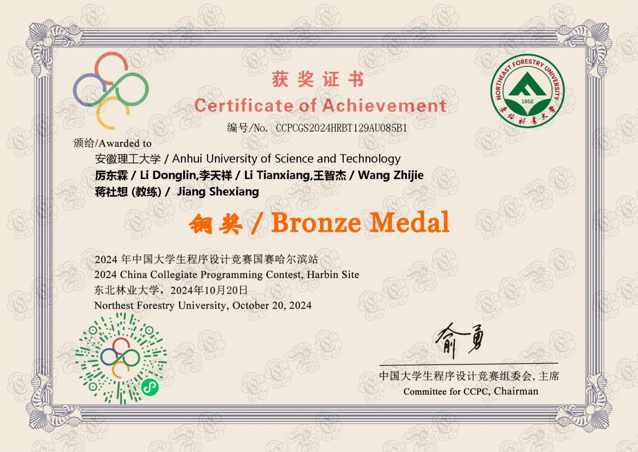 10月20日,中国大学生程序设计竞赛(CCPC)在哈尔滨举行。本次比赛由东北林业大学承办,吸引了来自全国178所高校279支队伍报名参加比赛。我校计算机科学与工程学院的学生厉东霖、李天祥、王智杰组成代表队,在指导老师带领下,表现出色,荣获铜奖。
