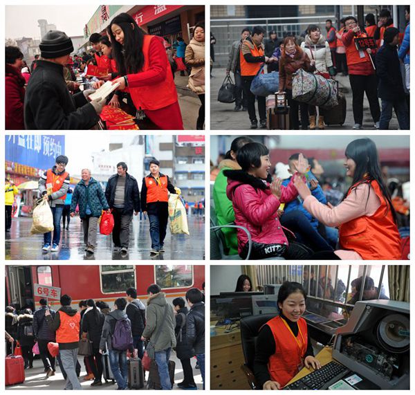 大学生志愿者们重点在引导咨询、秩序维护、重点帮扶、便民利民、应急救援等方面开展工作,为出行旅客提供便捷服务。在取票、售票窗口,志愿者们热情指引旅客购票、提供咨询;在候车室,细心为怀抱孩子的妇女、老弱病残旅客倒热水、看行李,并和小朋友们一起互动、游戏;在进站口,志愿者们主动把旅客大件的行李扛到肩上,直送到列车入口;在站前广场,志愿者引导旅客进站候车,并随时捡起地上的垃圾,保持乘车环境的清洁。