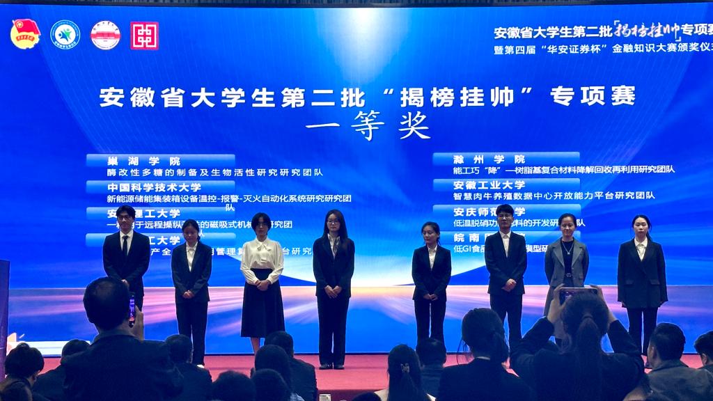 近日,由团省委、省教育厅、省科协、省社科院、省学联共同主办,合肥工业大学和华安证券股份有限公司承办的安徽省大学生第二批“揭榜挂帅”专项赛决赛落下帷幕。我校学子青春揭榜,挂帅出征成绩优异,荣获一等奖2项,二等奖4项,三等奖8项,获奖等次和数量位居全省高校第一位。